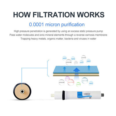 একটি অতিরিক্ত স্ট্যাটিক চাপ পাম্প ব্যবহার করে উচ্চ চাপ অনুপ্রবেশ উৎপন্ন হয় একটি বিপরীত ওসমোসিস ঝিল্লি মাধ্যমে জল অণু এবং আয়নিক খনিজ উপাদান পাস ভারী ধাতু, জৈব পদার্থ,পানিতে ব্যাকটেরিয়া এবং ভাইরাস